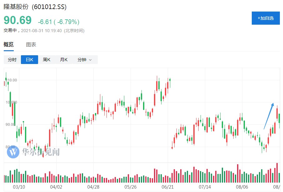 作为光伏行业龙头之一,隆基股份股价自 8 月 20 日以来强势反弹,从最低 77 元一路走高,周一更是大涨 7.15%,创下历史新高,市值突破 5000 亿。
