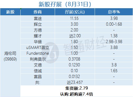 海伦司正在招股中。截至 8 月 31 日,辉立、富途、耀才、华盛等合计为其借出孖展近 23.457 亿港元,超购逾 7.4 倍。