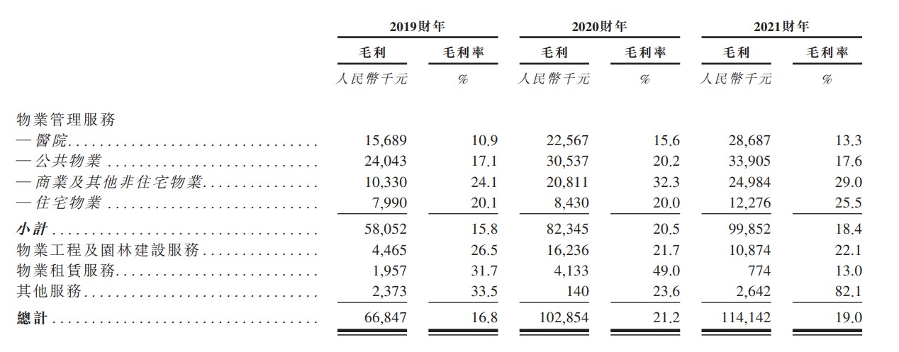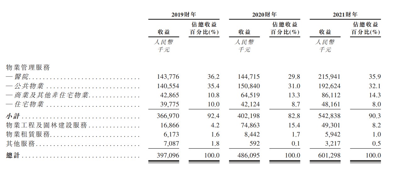 就物业管理服务而言,2020 财年,该公司有 30 家在管医院及 95 个在管公共物业。根据弗若斯特沙利文报告,按 2020 年各板块所产生的收益计,在山东省物业管理服务供应商中,公司在医院及非住宅(包括医院、公共物业及商业物业)板块分别位列第二及第三,分别约占市场份额的 5.6% 及 1.8%。就整体中国物业管理行业各领域产生的收益而言,公司于医院领域的市场份额分别约为 0.5% 及于非住宅(包括医院、公共物业及商用物业)的市场份额约为 0.3%。