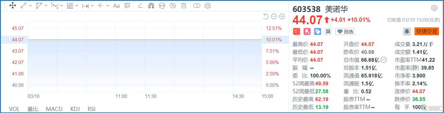 今日,美诺华(603538)全天一字强势涨停,涨停价为 44.07 元,成交额为 1.41 亿,最新总市值为 66.68 亿。元截至收盘,涨停价仍有 70521 手买单,买方力量很强劲。3 月 8 日至今,短短三个交易日,该股已经连续收获三个涨停板。