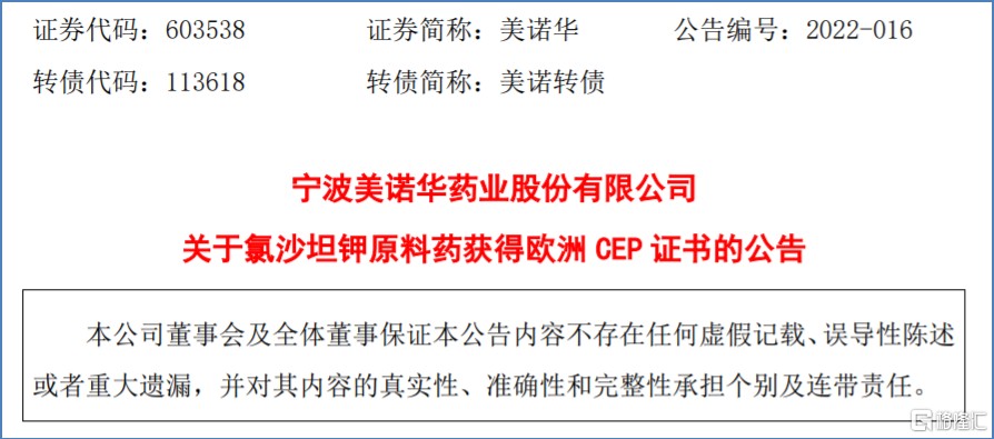 三日连续涨停,或许还与另一则消息有关,公司 3 月 7 日发布公告称,目前已收到欧洲药品质量管理局签发的关于氯沙坦钾(原料药)欧洲 CEP 证书(欧洲药典适用性证书),该药主要用于治疗原发性高血压。时间线就是,公司于 2021 年 8 月 3 日向 EDQM 提交了氯沙坦钾(原料药)的 CEP 申请,并于 2022 年 3 月 4 日获得 CEP 证书。