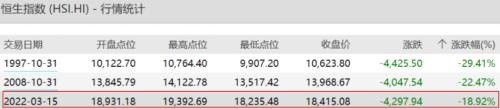 截至 3 月 15 日,恒生月内跌幅 18.92%,创下 30 年来第三:仅次于 1997 年 10 月和 2008 年 10 月,前两次分别对应亚洲金融危机时索罗斯做空港元和美国次贷危机,下跌幅度分别为 29% 和 22%。