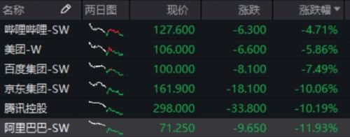 从今日个股表现看,互联网龙头的下跌并没有刹车,成交量普遍放大。其中,阿里巴巴跌 11.93% 收于 71 港元,创香港上市新低,成交额 124 亿港元放大近 5 成;腾讯跌 10.19% 收于 298 港元,成交额 367 亿港元较昨日放大近 6 成。
