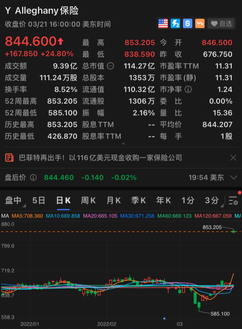 截止 3 月 21 日每股收盤,Alleghany 報 844.600 美元/股,漲 24.80%。