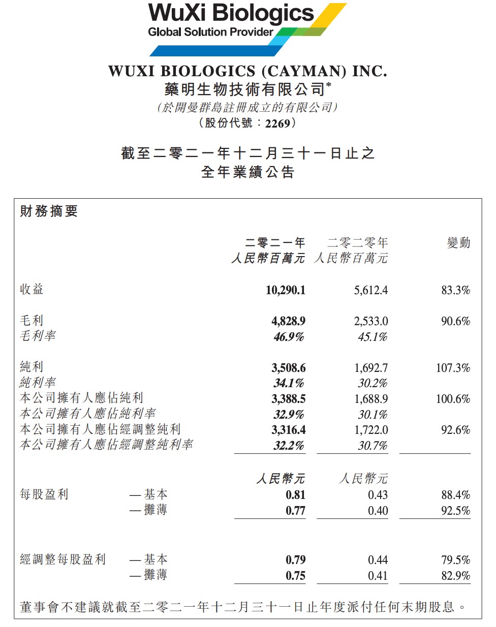 药明生物发布截至 2021 年 12 月 31 日止年度业绩,公司取得收益人民币 102.9 亿元,同比增长 83.3%;纯利 35.09 亿元,同比增长 107.3%,此前预告为同比增长 105% 以上;公司拥有人应占纯利 33.89 亿元,同比增长 100.6%,此前预告为增长 98% 以上;每股基本盈利 0.81 元。盈利略超此前预告。