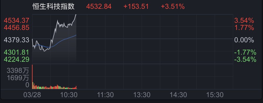 截至发稿,恒生指数涨 1.46%,恒生科技指数涨 3.5%。