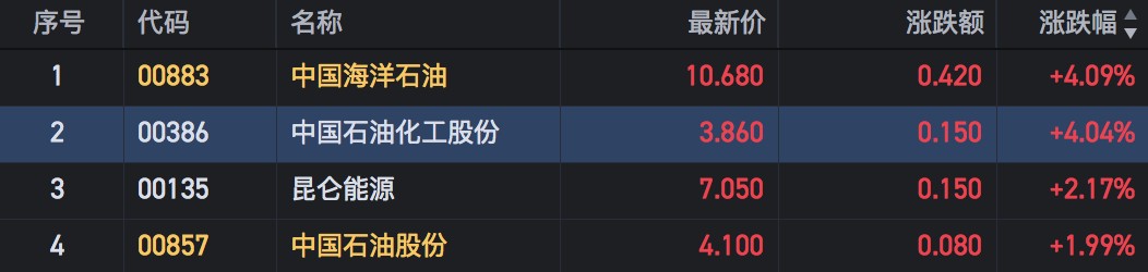 中国海洋石油、中国石油化工涨超 4%,昆仑能源涨超 2%,中国石油股份涨近 2%。