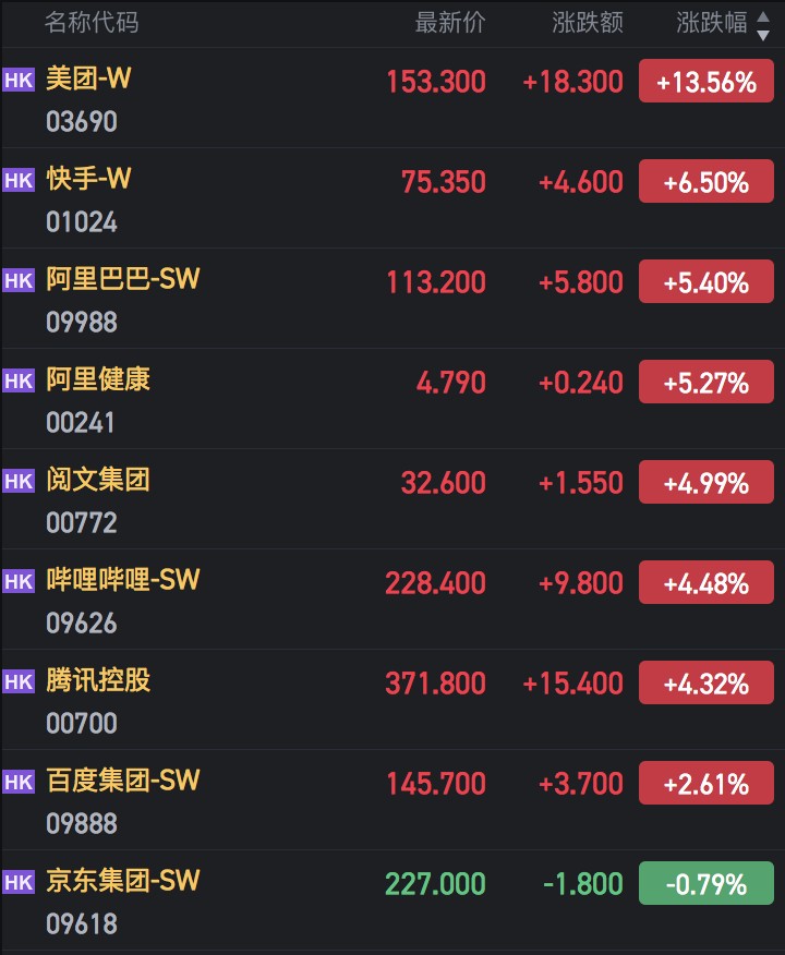 美团涨超 13%,快手涨超 6%,阿里巴巴涨超 5%、腾讯控股、B 站涨超 4%。