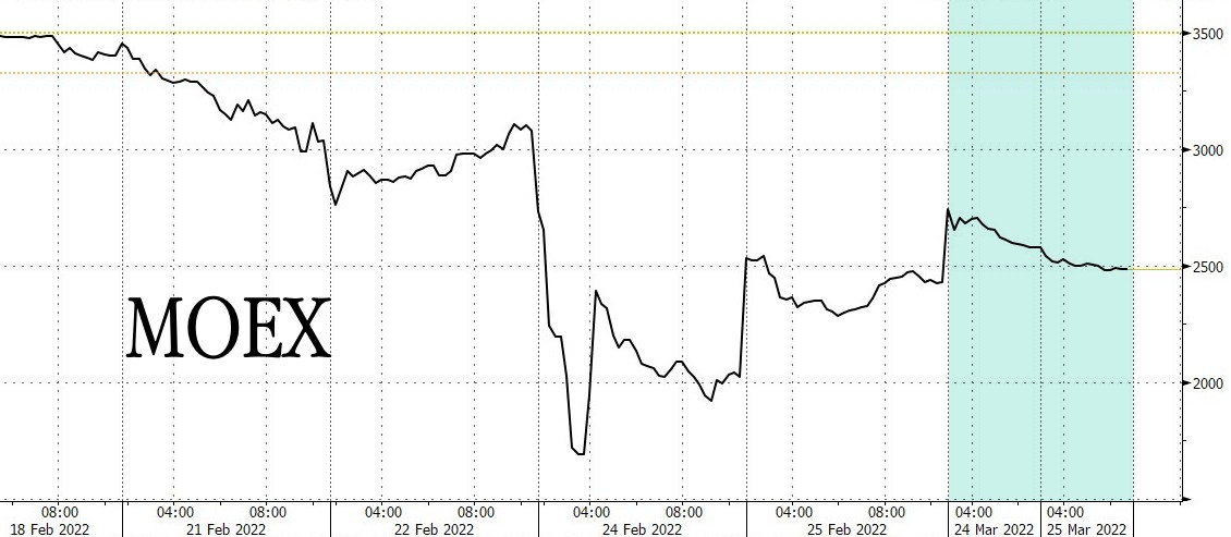 3 月 24 日周四,莫斯科证券交易所恢复了 33 只流动性最强的股票进行交易,其中包括俄罗斯天然气工业股份公司、俄罗斯联邦储蓄银行等企业的股票。同时,禁止卖空并禁止外国人出售所持证券。随后,基准股指 MOEX 上涨 4.4%。不过,涨势在 25 日未能延续,MOEX 收跌 3.7%。