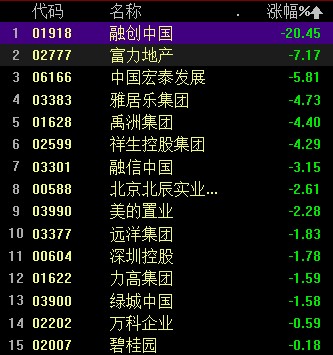 富力地产、正荣地产跌超 5%,龙湖集团跌近 4%,世茂集团、中国奥园跌近 3%。