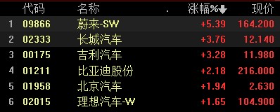 蔚来涨超 5%,吉利汽车、长城汽车涨超 3%,小鹏汽车涨近 3%,理想汽车涨超 1%。