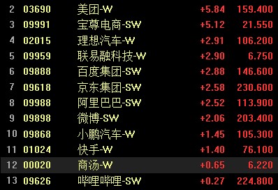 京东健康涨超 14%,阿里健康涨超 8%,美团涨超 5%,腾讯涨超 3%,阿里涨超 2%。