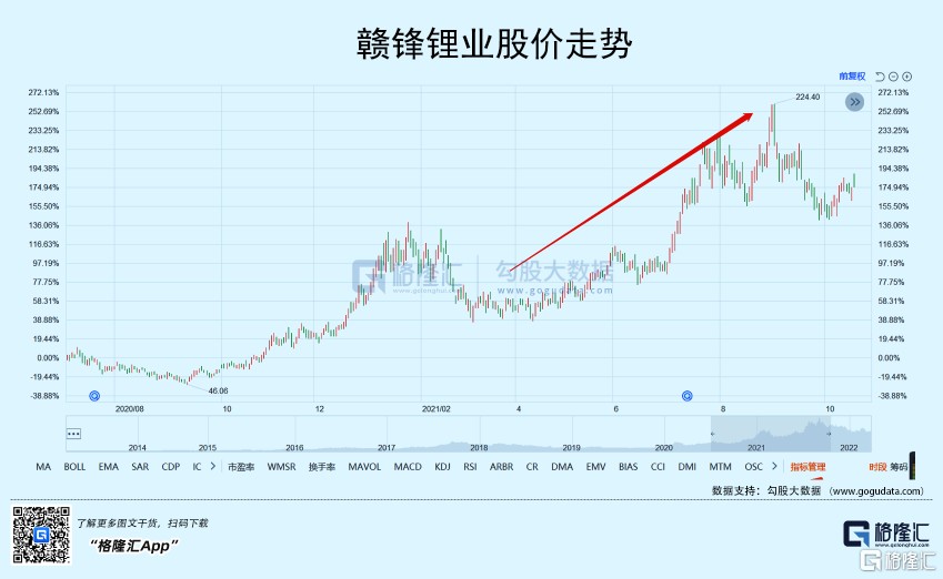 2021 年 4 月开始,在跟随大盘进行 1 个月左右的修整后,赣锋的股价从 86 块一路上涨到 8 月底的 224 块,4 个多月,涨幅高达 160%,甚至超过宁德时代,成为那段时间最为耀眼的锂电概念股之一。
