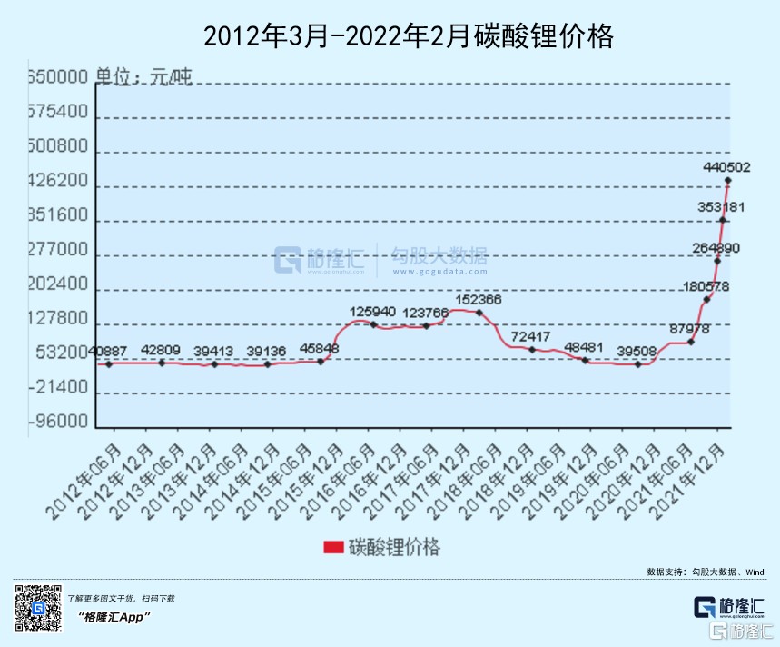 以碳酸锂为例,2020 年 6 月,价格还不到 4 万/吨,一年之后的 21 年 6 月,价格已经翻了一倍多,接近 9 万/吨,但这也只不过是碳酸锂价格疯狂暴涨的开始。自此,碳酸锂价格每个月都在刷新历史记录,10 万、20 万、30 万、40 万,这个月还达到了创纪录的 50 万一顿,可以说没有最高,只要更高。