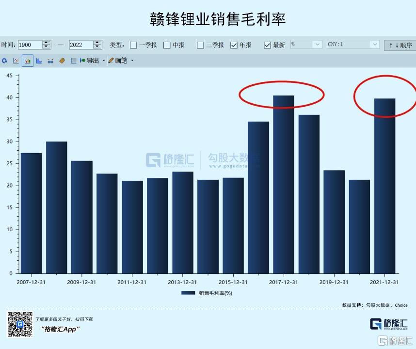 价格大涨的情况下,作为龙头的赣锋,自然是享尽利好,从营收利润的大涨就可以看出来。而最为耀眼的财务指标,还得算毛利率的大幅提升,2021 年毛利率为 39.81%,较 2020 年同期接近翻倍,并已经恢复至 2017 年的高峰位置。