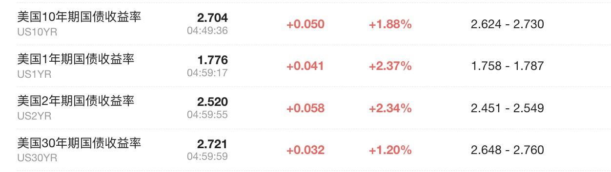 截至目前,美债收益率仍呈上涨态势,基准 10 年期美债收益率已经涨至 2.704%。