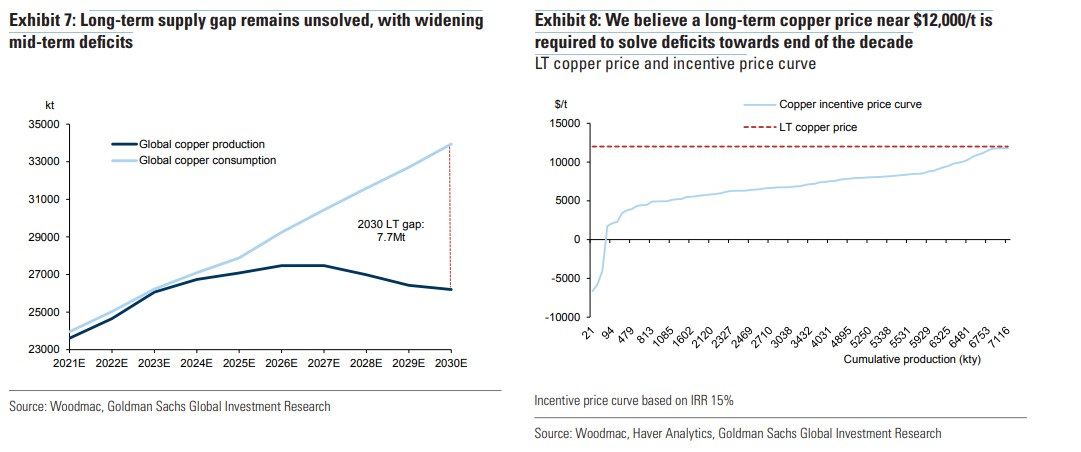 高盛指出,虽然铜价自 2020 年 5 月以来上涨了 117%,但铜矿长期供应却没有做出明显反应。高盛预计截至 2030 年的长期供应量为 770 万桶,预期与一年前基本持平。