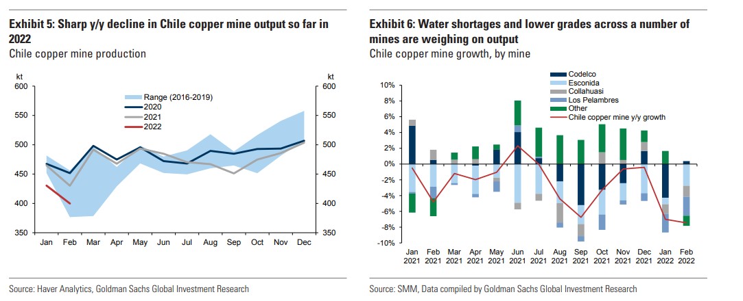 高盛预计,受水资源短缺以及订单等级下降影响,智利一季度铜产量将下降 5%-10%。