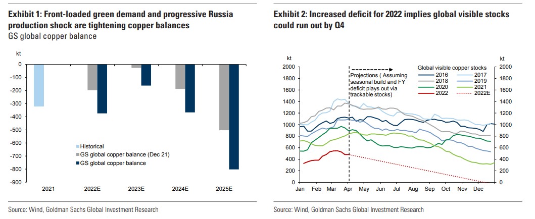 他们预计 2022 年精炼铜缺口将达到 37.4 万吨,是之前估计的两倍,称现有库存或将在第四季度耗尽。此外,高盛还将 2023 年精炼铜缺口预期从此前的 2.8 万吨增加至 16.1 万吨,2024 年预期从此前的 18.7 万吨增加至 36.6 万吨。