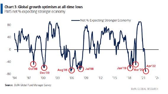 美银最新的基金经理调查显示,对于全球经济的乐观情绪跌至了历史新低,全球投资界对经济衰退的恐惧大幅飙升。4 月份的调查显示,预计经济将会恶化的投资者比例创出有史以来的最高。