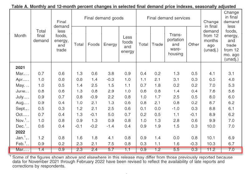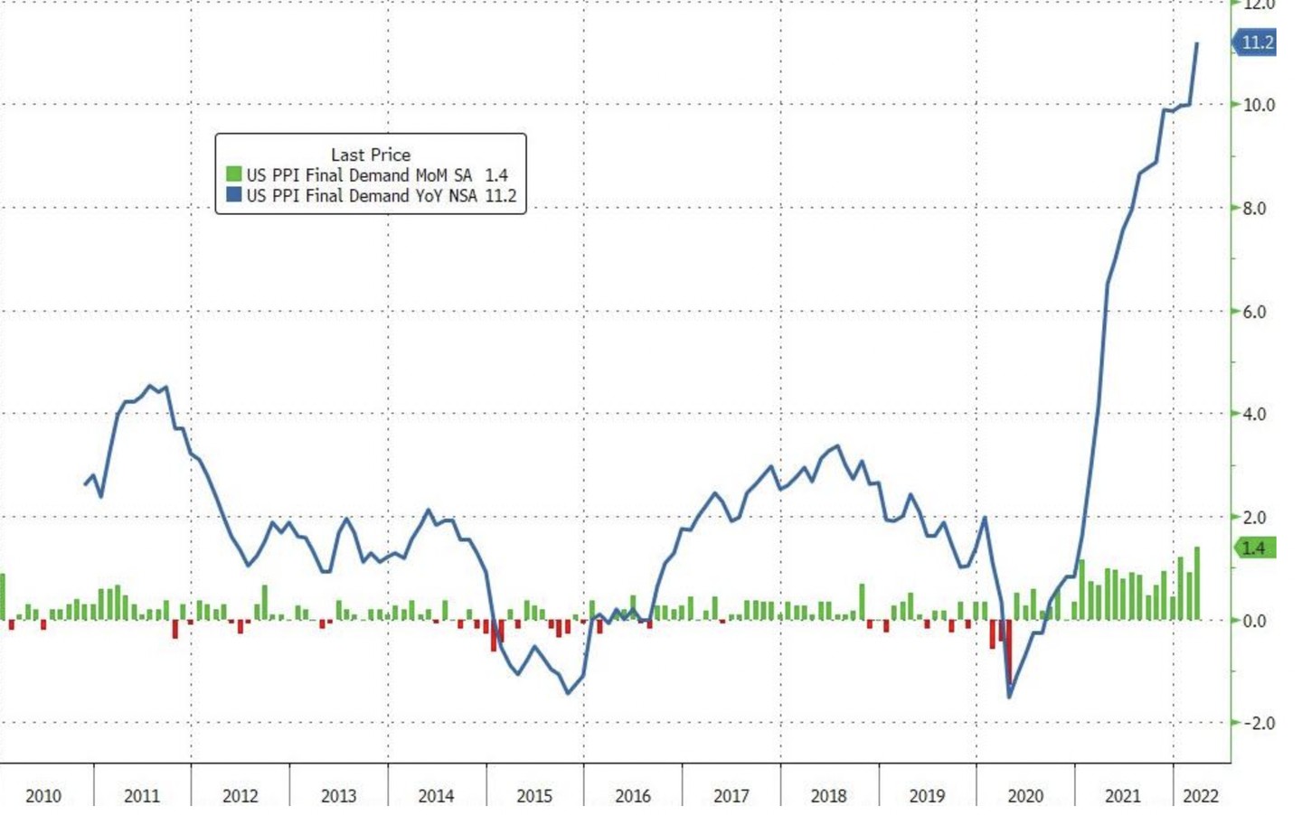 4 月 13 日周三,美国劳工部发布的数据显示,美国 3 月 PPI 同比增长 11.2%,为该机构 2010 年 11 月统计以来的最大同比增速,高出市场预期值 10.6%,超出前值 10%。环比上涨 1.4%,同样为有记录以来最高值,预期值 1.1%,前值为 0.8%。