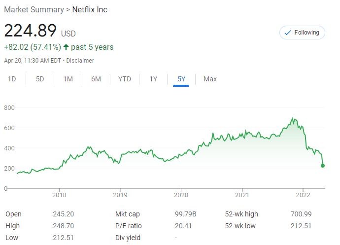 奈飞盘初最深跌 39%,跌幅创 2004 年以来的十八年最深,股价日低下逼 210 美元整数位,至 2018 年 1 月中旬以来的四年多新低,今年以来已经跌价逾六成。
