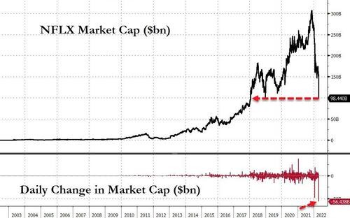 因一季报和下季指引均不佳、11 年来付费用户首度流失,流媒体巨头奈飞最深跌 39%创 2004 年来最大盘中跌幅,收跌 35%,至 2018 年 1 月 19 日来的逾四年新低,市值抹去 560 亿美元。今年跌价 63%,是标普 500 指数和纳指 100 中表现最差的成分股,10 位华尔街分析师下调评级。