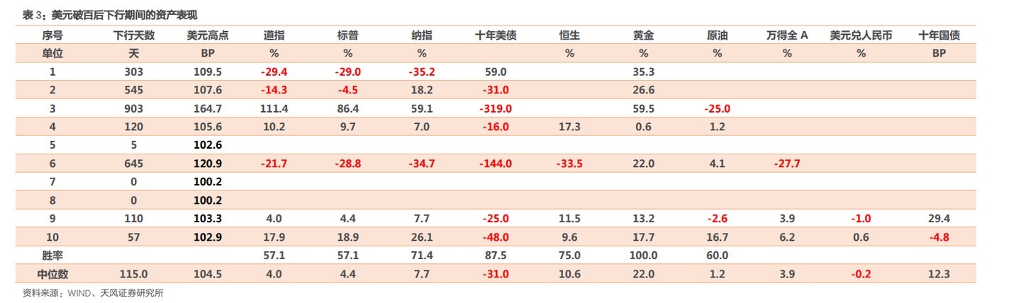 在美元破百后,美元下行至百点关口过程中,在可参考样本中,权益市场方面,美股道指和标普没有表现出明显规律,纳指胜率较高。恒生指数较高胜率。十年期美债收益率大多数时期下行。黄金均获得了正收益,石油也有半数以上胜率。