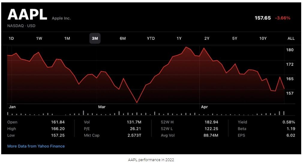 由于担心美联储激进加息和供应链干扰,苹果股价在一季度累跌 1.8%,期间发生过多次三日连跌,今年 1 月份更是曾连续八日下挫。