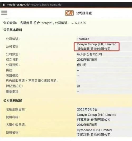 5 月 8 日,财通社从香港公司注册处发现,字节跳动(香港)有限公司,已更名为抖音集团(香港)有限公司,生效时间为 2022 年 5 月 6 日。