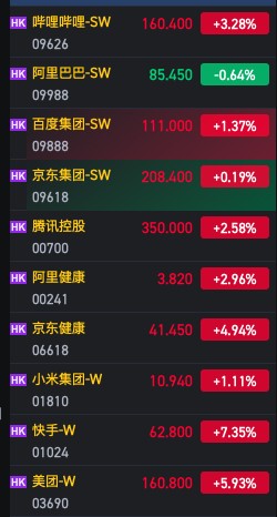 快手涨超 7%,美团涨近 6%,京东健康涨近 5%,哔哩哔哩涨超 3%,腾讯涨 2.58%。