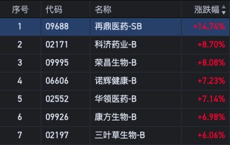 截至目前,再鼎医药涨近 15%,复星医药涨超 11%,科济药业、荣昌生物、药明生物涨超 8%,康方生物涨近 7%。