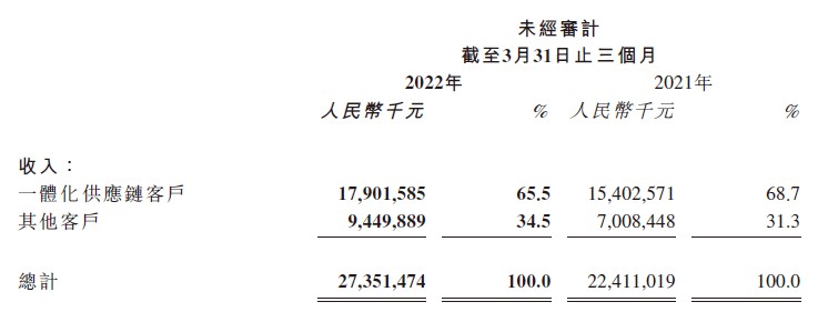 数据显示,报告期内公司实现营业收入 273.5 亿元,同比增长 22.0%,收入增长稳健;期间亏损 13.5 亿元,同比收窄 87.7%,盈利水平持续改善;经调整亏损 7.98 亿元,同比亏损减少 41.6%。此外,外部客户收入达 160 亿元,占比 58.4%;来自一体化供应链客户收入达 179 亿元,同时外部一体化供应链客户数量同比增长近 20%。