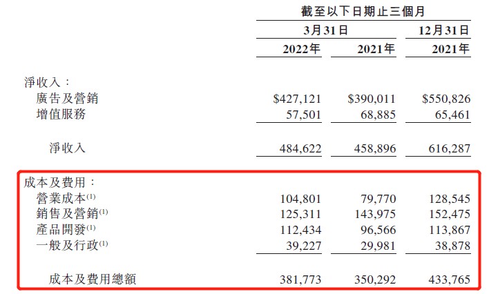 在费用端,微博一季度成本和费用达 3.818 亿美元,较上年同期的 3.503 亿美元增长 9%。公司表示,相关增长主要受人员相关成本、冬奥会相关内容成本增长影响。由于渠道投资优化和线下活动的减少,公司销售和营销费用有所下降。