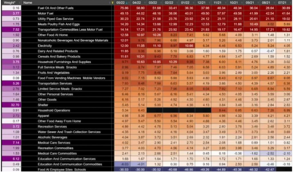 几乎整个 CPI 篮子中所有项目都在上涨,与一年前相比,只有两样东西更便宜,员工食堂食物、教育和通信商品。