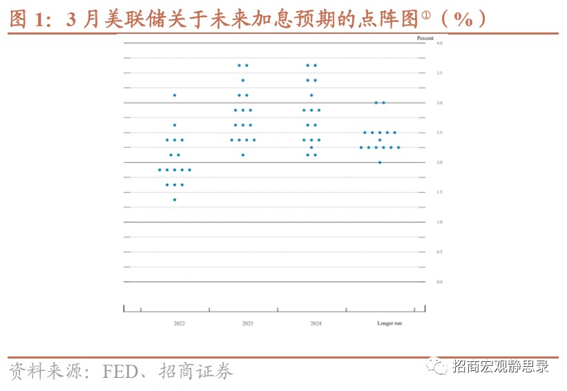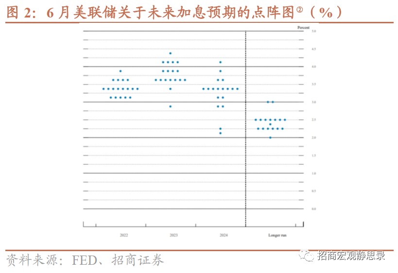 75BP 加息是否超预期?为何会后美股美债齐涨?美联储发布 6 月议息会议声明,上调联邦基金目标利率 75BP 至 1.50%-1.75% 区间,维持 5 月 FOMC 给出的 6-7 月减持 300 亿美元/月美债和 175 亿美元/月 MBS 的缩表节奏不变。有趣的是,议息会议前夕美联储并未向市场清晰传递 75BP 加息信号,按理说该操作有些超预期,但会后美股美债齐涨。两点原因:首先,上周五公布的 5 月美国 CPI 大超预期,此后市场开始快速对本次议息会议上加息 75BP 定价,这也是上周五到本周一海外市场巨震的主因。截止 6 月 15 日议息会议前夕,市场已经完全 Price-in 本次加息幅度,进而靴子落地当日市场表现为利空暂时出尽。此外,3 月 FOMC 点阵图显示未来两年美联储将循序渐进式加息;而本次 FOMC 点阵图则显示年内大幅加息、明年小幅加息后,后年联储有望开始降息。换言之,与此前遥遥无尽的长痛预期相比,加息似乎仅是年内的短痛了。
