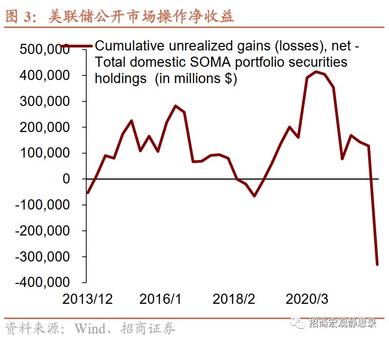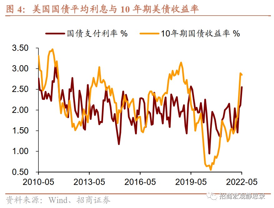 美联储已经 “加不起息” 了,但距离结束加息还差一个理由。美联储数据显示,2022Q1 公开市场操作(SOMA)已令美联储巨亏 3305.0 亿美元,为历史之最。而 2018 年美联储全年亏损 926.1 亿美元之后就曾结束加息。此外,如图 4 所示,美国国债的平均利息与 10 年期美债收益率相近,目前 10 年期美债收益率已经明显高于 3%,而本次 FOMC 美联储大幅下调今年美国经济增速至 1.7%。尽管今年美国通胀中枢极高,但与疲软的经济增速相比,美国财政(利息支出)负担已然是不可承受之重。但是,美联储的政策目标终究是就业与通胀,“加不起息” 并不等于可以不加息,所以鲍威尔在讲话中仍然强调了通胀压力、7 月 FOMC 再度加息 50-75BP 的可能,并在答记者问中多次表达了年底引导联邦基金利率到 3%-3.5% 左右的想法。