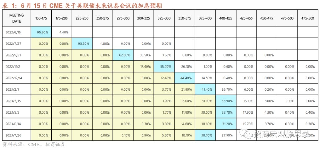 75BP 加息是否超预期?市场似乎有了 “盼头”。有趣的是,5 月 FOMC 上,鲍威尔几乎排除了未来加息 75BP 的可能性,且议息会议前夕美联储也并未向市场清晰传递 75BP 加息信号,按理说该操作有些超预期,但为什么会后美股美债齐涨?原因之一是上周五公布的 5 月美国 CPI 同比为 8.6%,刷新 1982 年以来新高,此后市场开始快速对本次议息会议上加息 75BP 定价,这也是上周五到本周一海外市场出现股债齐跌的主因。如表 1 所示,截止 6 月 15 日议息会议前夕,市场已经完全 Price-in 本次加息幅度,进而靴子落地当日市场表现为利空暂时出尽。此外,3 月 FOMC 点阵图显示未来两年美联储将循序渐进式加息;而本次 FOMC 点阵图则显示年内大幅加息(至 3.25%-3.5%)、明年小幅加息(3.75%-4.0%)后,后年联储有望开始降息,CME 市场更是预期明年 Q1 美联储将基准利率推升至 4% 后,将于 2023Q3 进入降息周期(如表 1)。换言之,与此前遥遥无尽的长痛预期相比,加息似乎仅是年内的短痛了。