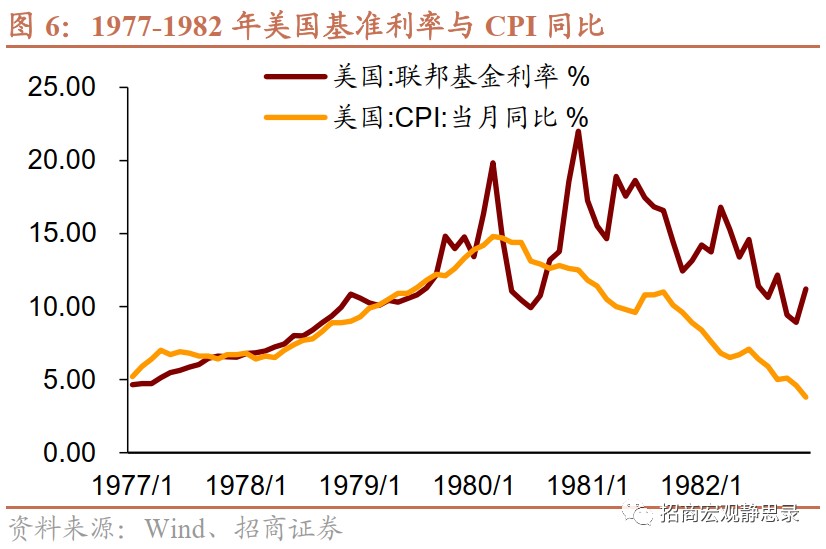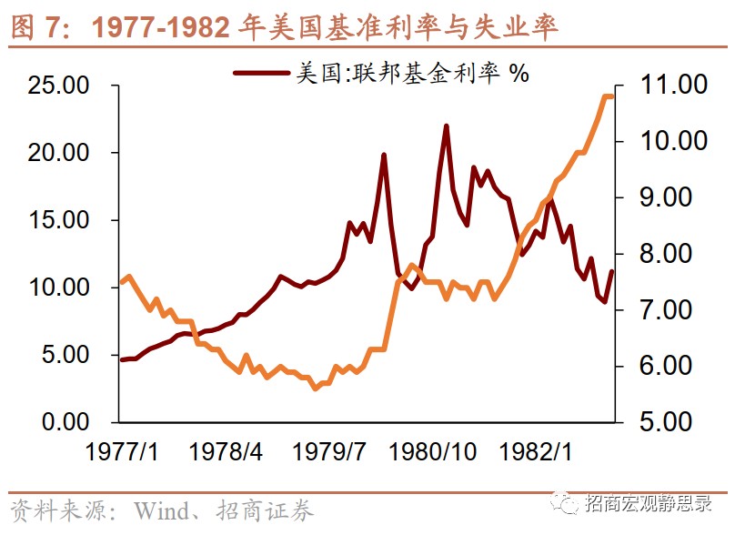 我们应该把注意力由通胀转向就业了。我们在 5 月美国 CPI 点评《油价的最后一冲:假如美国 CPI 不回落?》中指出,5 月美国 CPI 创新高的 “元凶” 是能源,假若油价继续超预期上涨,不排除年内美国 CPI 与核心 CPI 同比均维持当前高位水平的可能性。但复盘沃尔克时期的联储政策可知,即便在高通胀背景下,加息也不是必然的,打败高通胀的是 “高企的失业率”。1979 年 7 月沃尔克上任后开始快速、大幅加息,直至 1980 年底美国基准利率曾被推升至 20% 上方,但此间(1980 年 4-7 月)美联储也曾短暂降息。结合图 6-7 可知,该阶段的降息并非通胀回落的结果,而是为了应对失业率持续攀升。