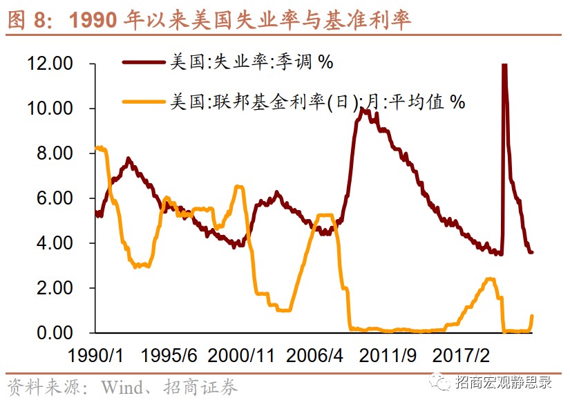 用就业目标打败通胀目标。我们认为之所以本次 FOMC 点阵图中美联储给出了 2024 年或将进入降息周期的暗示,正是因为美国经济面临下行风险、失业率接近触底。在经济展望中,美联储除大幅上调今年 PCE 同比至 5.2%(3 月预期为 4.3%)外,还将今年经济增长预期由 3 月的 2.8% 进一步大幅下修至 1.7%。不仅如此,本次经济展望还将年内失业率预期上调至 3.7%,由于 3-5 月美国失业率连续 3 个月维持在 3.6%,因此美联储似乎暗示了年内美国失业率回升的可能性。如果说在以对抗通胀作为几乎唯一目标的 70-80 年代,美联储仅是兼顾就业、在失业率快速走高的时候选择临时降息;那么,90 年代以来就业因素在货币政策中的权重显然更高,如图 8 所示,1990 年以来但凡美国失业率回升,美联储就会结束加息甚至进入降息周期。回到当下,我们与其绞尽脑汁预判美国通胀拐点,不如换个思路,探讨一下失业率何时回升。