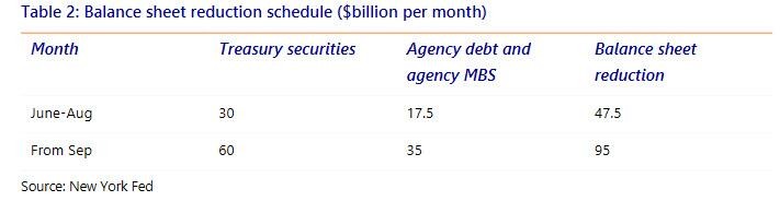 缩表终于在 6 月 1 日开始,距离通货膨胀开始飙升已有一年多的时间。经过三个月的调整期后,资产负债表的缩减将通过每月 600 亿美元的国债和 350 亿美元的机构抵押贷款支持证券(MBS)进行。这一过程始于 6 月,当时美国国债的上限为 300 亿美元,机构债券和机构 MBS 的上限为 175 亿美元