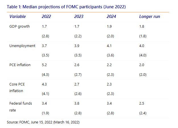 GDP 和失业率数据显示,FOMC 仍预计经济将软着陆。美联储预计,2022-2024 年 GDP 年增长率不低于 1.7%,2024 年最后一个季度失业率仅上升至 4.1%(目前失业率为 3.6%)。然而,最新预测仍然比 3 月份的预期要弱,当时 FOMC 认为 2024 年的失业率将为 3.6%,而 2022-2024 年的 GDP 增长将大幅提高。