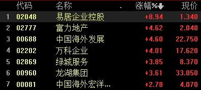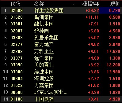 地产股逆势高涨,禹洲集团涨超 15%,正荣跌超涨超 11%,新城发展涨超 7%,绿景中国地产、合景泰富集团涨近 5%,碧桂园、富力地产涨近 4%。