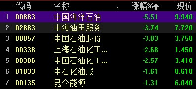 石油股持续走弱,中国海洋石油跌超 5%,上海石油化工股份、中国石油股份、中海油田服务跌超 3%。