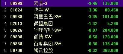 科技股走低,网易跌超 10%,京东跌超 5%,阿里跌近 5%、快手跌超 3%,腾讯、百度、小米、B 站跌不到 1%。