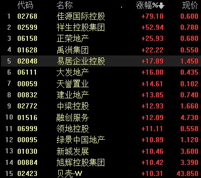 地产股强势爆涨、集体狂飙,佳源国际控股盘中一度涨 97%,祥生控股涨超 60%,正荣地产涨超 30%,禹洲集团涨超 20%,富力地产涨超 10%,碧桂园涨超 7%。