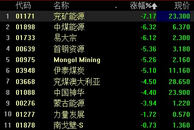 煤炭概念股走低,中煤能源跌超 5%,兖矿能源跌近 5%,首钢资源、伊泰煤炭、兖煤澳大利亚跌超 4%,中国神华跌近 4%。
