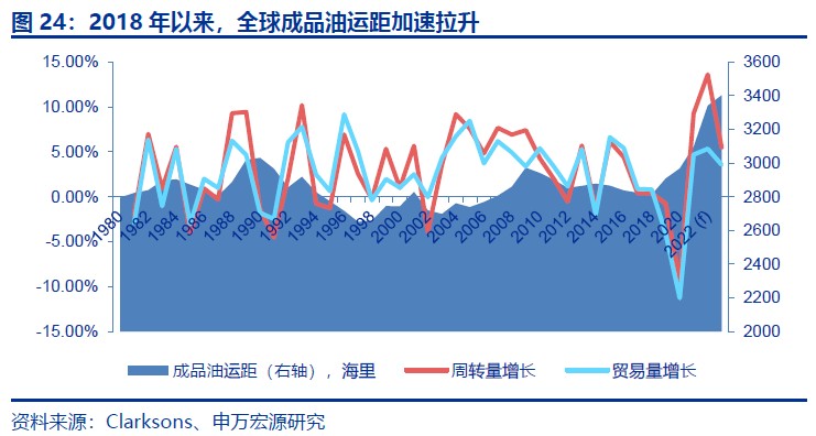 “2018 年以来,成品油平均运距从 2800 海里提升至 2021 年的 3097 海里,受俄乌冲突影响 2022、2023 有望提升至 3340 海里以上。”