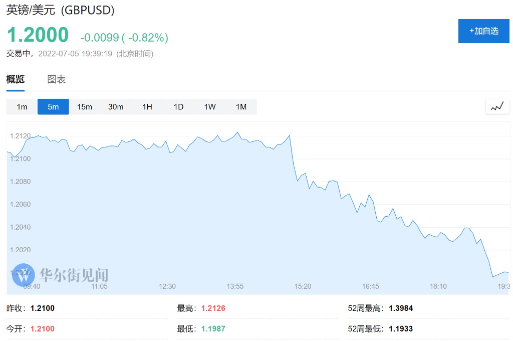 英镑兑美元跌幅一度扩大至 1%,截至发稿,跌幅为 0.82%,报 1.200;新西兰元兑美元跌 1.1%至 0.6140,创 2020 年 5 月以来的新低。