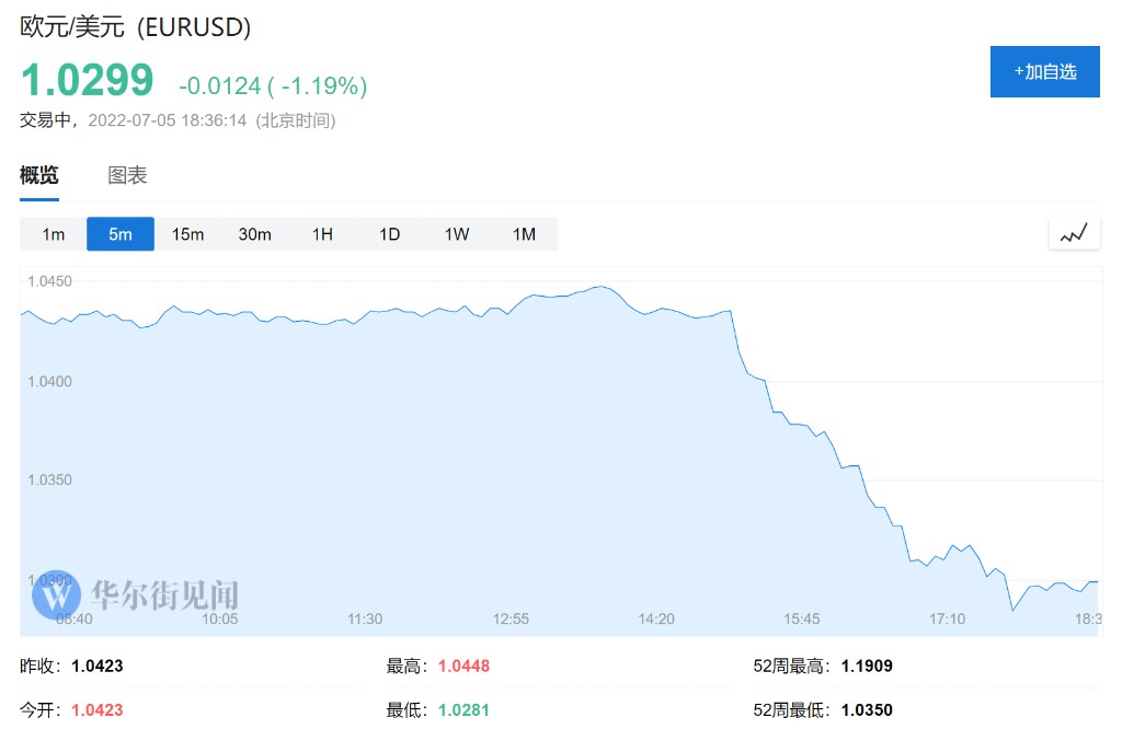 欧元兑美元跌幅扩大至 1.19%,报 1.0299,续创 2002 年以来新低,因衰退风险上升,投资者削减对欧洲央行加息的押注。